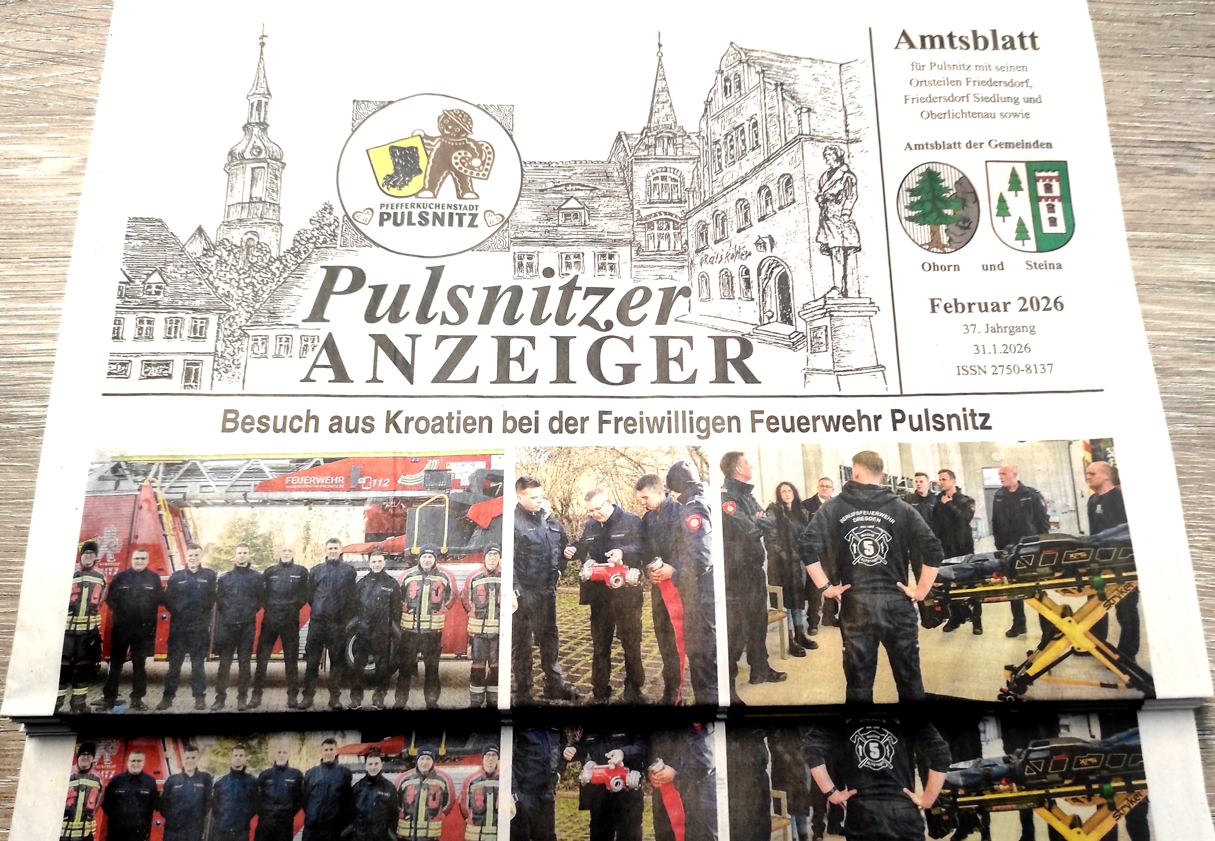 [28.1.2026] Die Februar-Ausgabe des Amtsblattes „Pulsnitzer Anzeiger“ erscheint am 31. Januar. Ausgewählte Themen sind die neuen Pulsnitz-Souvenirs zum Mitnehmen (S. 2), die Stellenausschreibungen der Stadt Pulsnitz bzw. der Gemeinde Steina (S. 3), der Kulturnachmittag in der Bibliothek mit Madame Rosa (S. 4), die Stellungnahme des Pulsnitzer Heimatvereins zum Torbogen am Herrenhausplatz (S. 5) sowie der Jahresrückblick der Pulsnitzer Feuerwehr 2025 (S. 7).