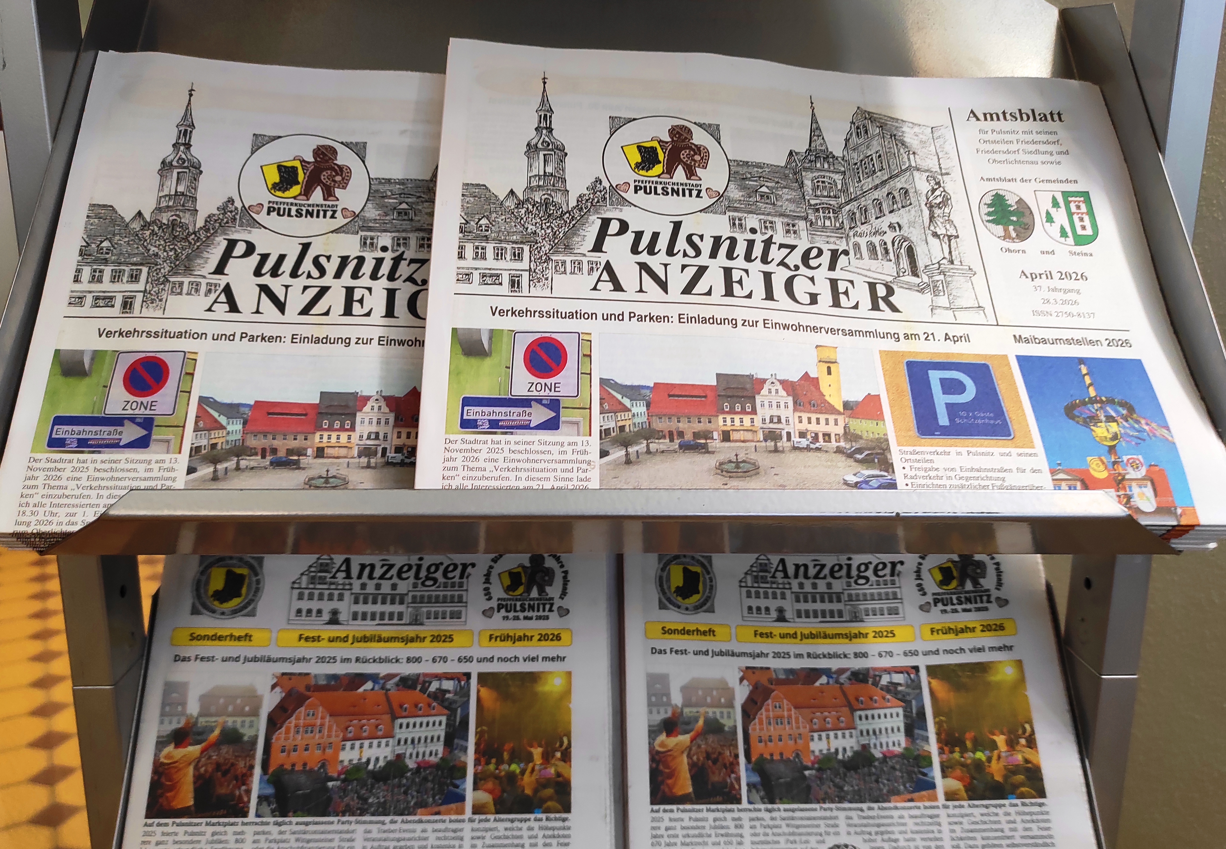 [28.3.2026] Die April-Ausgabe des Amtsblattes „Pulsnitzer Anzeiger“ liegt seit dem 28. März zur Mitnahme aus. Ausgewählte Themen sind die Einladung zur Einwohnerversammlung am 21. April sowie zum Maibaumstellen am 29. April (beide S. 1), das Sonderheft zum Fest- und Jubiläumsjahr 2025 (S. 1), die Verkehrseinschränkungen in der Stadtfestwoche (S. 2), die Saisoneröffnung in der Ostsächsischen Kunsthalle (S. 4) sowie die Veranstaltung zum 30-jährigen Bestehen des Reit- und Fahrvereins Pulsnitz am 3. Mai (S. 5).