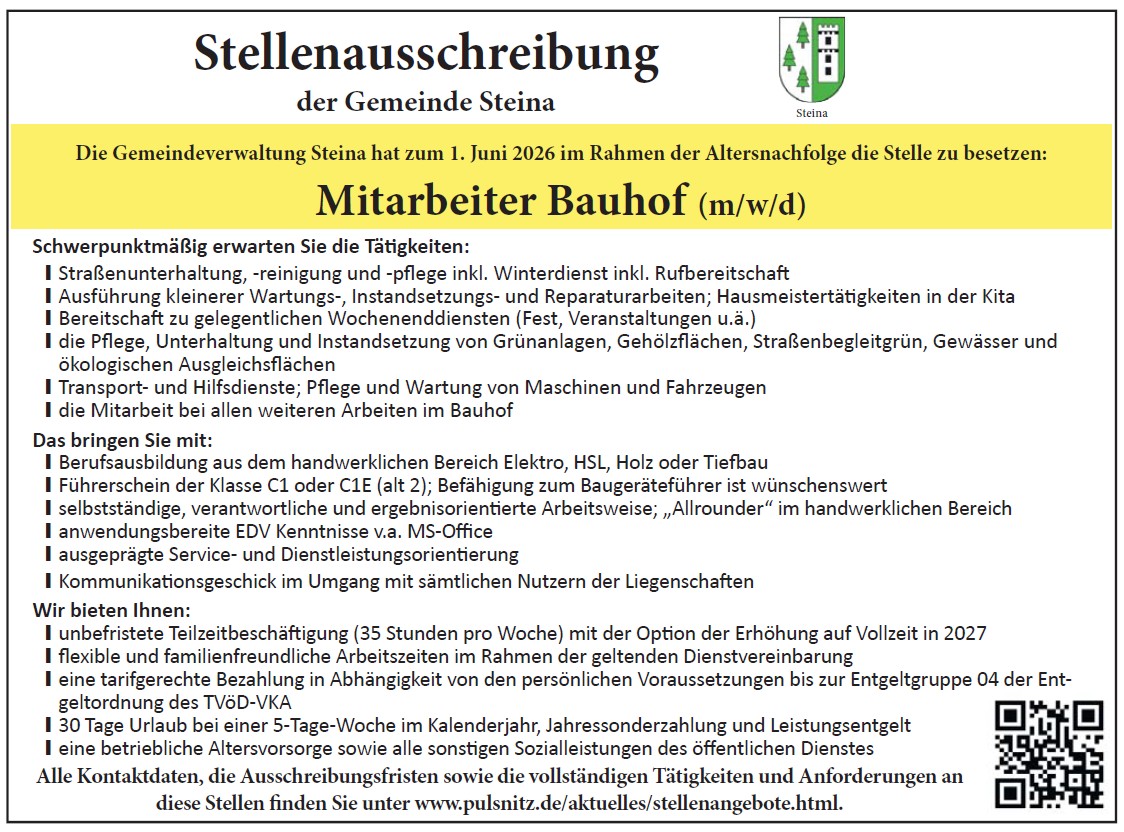 Die Gemeindeverwaltung Steina hat zum 1. Juni 2026 im Rahmen der Altersnachfolge die Stelle Mitarbeiter Bauhof (m/w/d) zu besetzen.